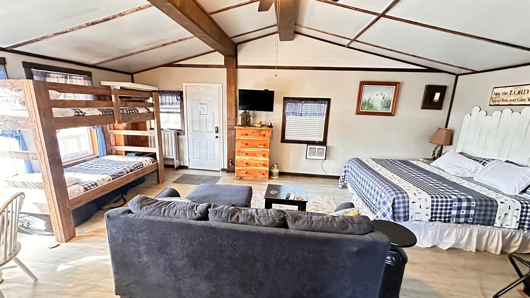 - 1 King Bed, 2 Twin Beds (bunk bed), 1 Travel Crib, and 1 Queen Floor mattress (Linens provided)